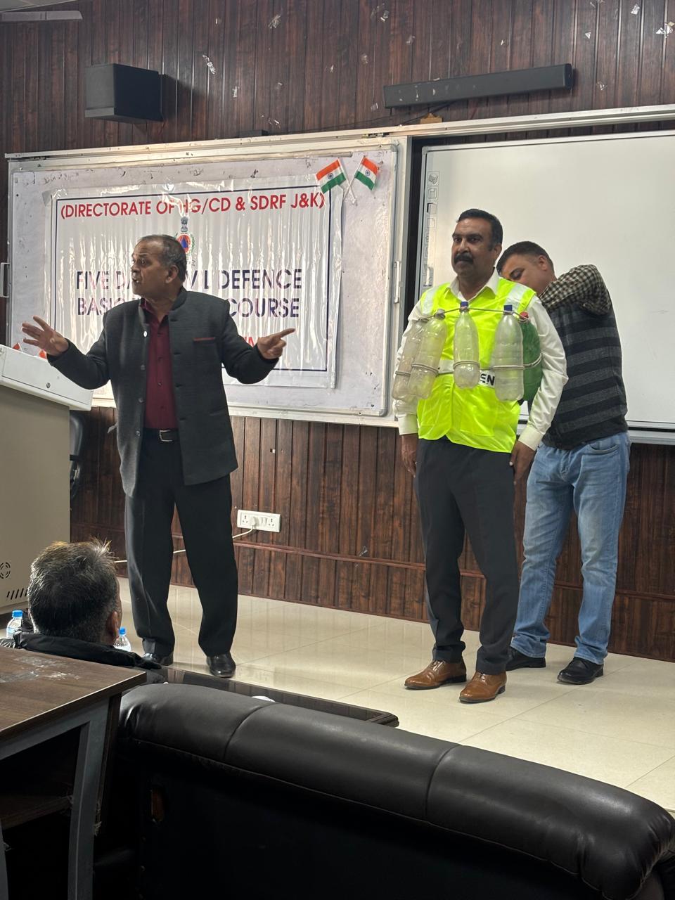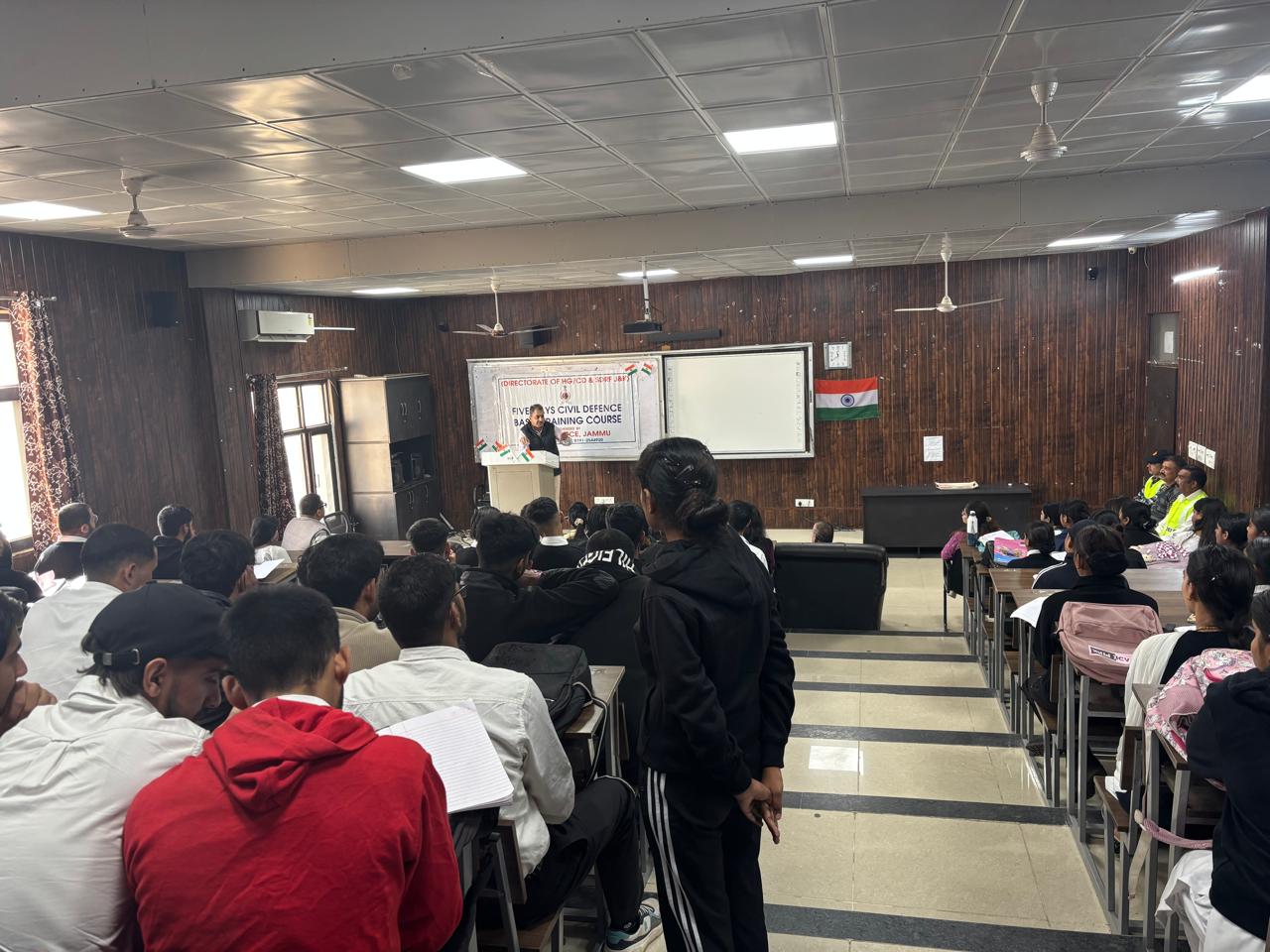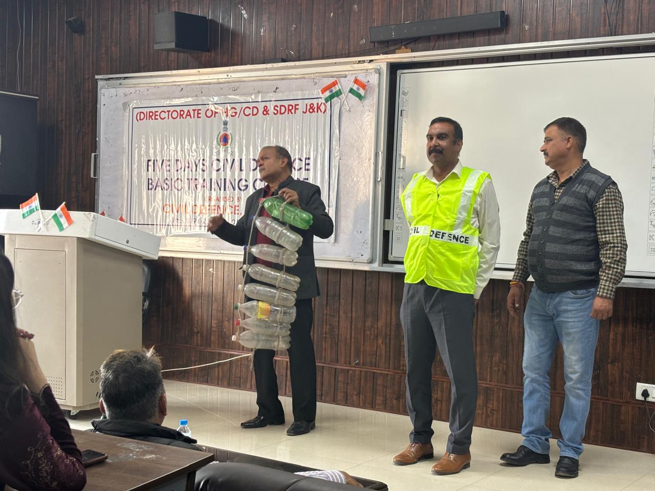 NSS and NCC unit of GDC Paloura in collaboration with Directorate of HG/ CD & SDRF J&K organised a Five Day Basic Training Course for students and staff of the college . The programme was organised under the guidance of Dr. Kulvinder kour , principal of the college. The programme was commenced with a welcome address of Dr. Sapna Sharma , NSS Program Officer , Cordinator of the Programme and Head of Department of Chemistry . In the initiation of the programme Prof. Geetanjali Multani and Dr. B. L. Thakur presented planters to DySP Zia Ul Haq and Chief Warden Paramjeet Kumar respectively . Dr. Sapna also spoke on the Importance of Civil Defence in these uncertain situations like Heavy Rainfall, Heavy Floods , Insurgency , Mock Drills etc . DySP Zia ul Haq briefed about the Five Day Civil Defence Training Program and also sensitised the students about the role of civil defence to protect people and property from threats like hostile attacks, natural disasters and anthropomorphic calamities . Chief warden Paramjeet Kumar along with the team demonstrated the students how to secure , safeguard oneself from over drowning and flooding just by using daily objects from the home ( plastic bottles , dry coconut shells , empty oil tins , bamboo sticks , plastic bags etc) . Instructor Rajinder Kumar introduced the students with the Genesis and Functioning of the Department . The programme was attended enthusiastically both by faculty members and students of the college. The whole programme was organised by Dr. Sapna Sharma and reported by Asst. Prof. Poonam Rainu .
