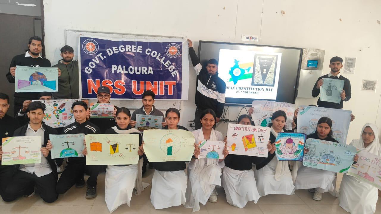 NSS unit of GDC Paloura in collaboration with Department of Political Science celebrated Indian Constitution Day 2025 .The programme was organised under the guidance of Dr. Kulvinder kour , Principal of the college. The programme was commenced with a welcome address of Dr. Sapna Sharma , NSS Program Officer , Cordinator of the Programme . Dr. Amit Bhalla delivered a lecture on the topic ,âHamara Samvidhan-Hamara Swabhimanâ. He spoke on the importance of the day. A Seminar on the official theme of National Constitution Day 2025 is âJustice Liberty Equality Fraternityâ and a poster making competition was also organised by Department of Political Science and NSS unit of the college . On the day a Pledge taking ceremony was held for all the staff members and students of the college . The programme was attended enthusiastically both by faculty members and students of the college. The whole programme was organised by Dr. Sapna Sharma , Prof. Amit Bhalla , Head of Department of Political Science and the activities were reported by Asst. Prof. Poonam Rainu .