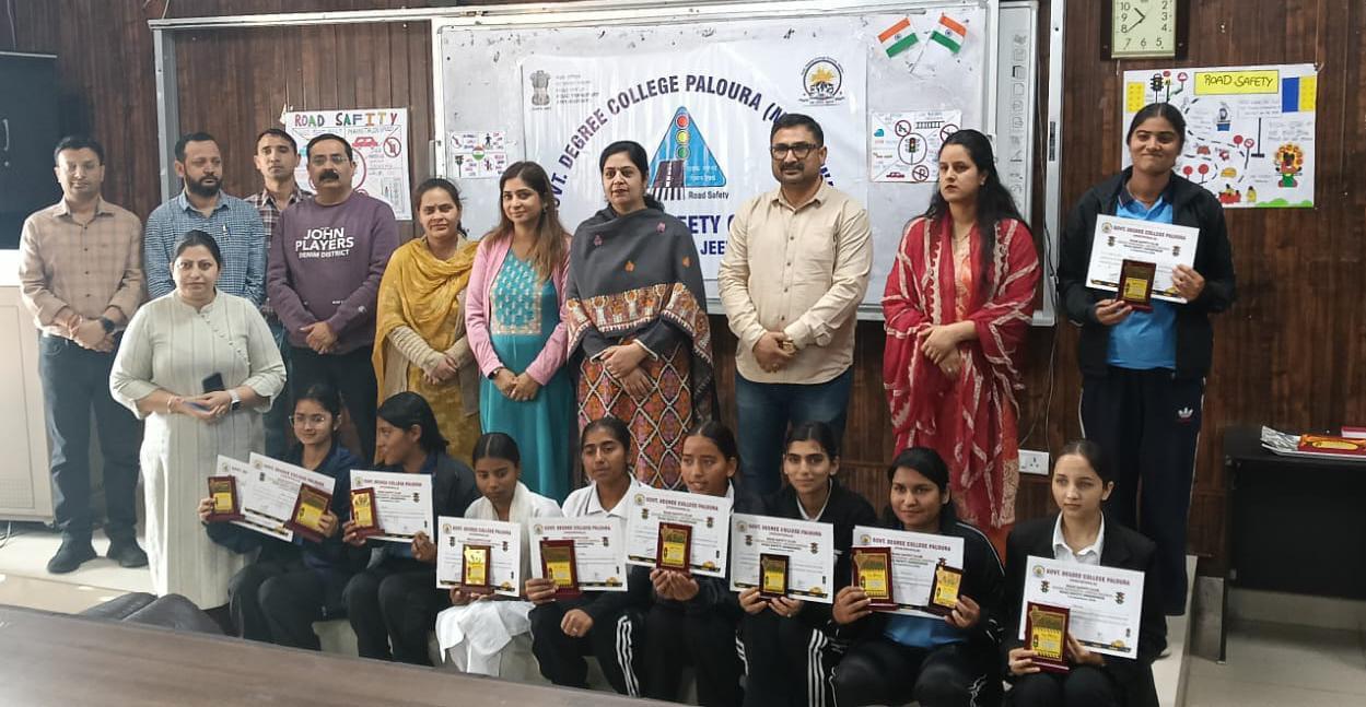The Road Safety Club of Government Degree College Paloura under the able guidance of Principal, Dr. Savi Behl, organized an award distribution ceremony with respect to series of road safety awareness activities under the theme “Sadak Suraksha Jeevan Raksha” with the objective of sensitizing students and the local community about the importance of road safety and responsible road behavior. To promote awareness about traffic rules and encourage safe driving practices several engaging and educational activities were conducted including a painting competition, slogan writing competition, elocution competition, awareness rally and wall painting. The events witnessed enthusiastic participation from students across different semesters who actively contributed their ideas and creativity to spread the message of road safety. On 25 th Feb, the painting competition provided students with a platform to visually depict the significance of safe driving, the importance of wearing helmets and seat belts, and the consequences of reckless driving. The competition was judged by Dr. Sapna Sharma and Prof. Poonam Rainu. In the event the First Prize was secured by Janvi, second shared by Madhavi and Preeti Chib and third by Janshee. The slogan writing competition was organized on 26 th Feb wherein the students showcased their creativity by composing meaningful and thought-provoking slogans that emphasized discipline on roads and respect for traffic rules. The competition was judged by Prof. Pooja Sharma and Dr. Gaurav Kumar. The winners of the event were Neelakshi Sharma, Phuntsok Angmo, and Sonu who secured first, second and third position respectively. The elocution competition was another highlight of the programme organized on 27 th Feb,where participants eloquently spoke on topics related to road safety and traffic awareness. The speakers highlighted issues such as over-speeding, mobile phone usage while driving, drunken driving, and the need for strict adherence to traffic regulations. The competition was judged by Prof. Geetanjali Multani and Dr. Babu Lal Thakur. Komal secured first position, Janvi Bhagat secured second position and Deepansh secured third position. To extend the message beyond the campus, the members of the Road Safety Club on 28 th Feb organized an awareness rally in and around the college premises. Students carried placards displaying road safety messages and raised slogans to encourage the public to follow traffic rules and adopt responsible behavior on roads. Janshee and Sneha of 6 th sem secured Ist and IInd position respectively in wall painting activities, where meaningful road safety messages and illustrations were created on designated walls within the college campus. Wall paintings were judged by Prof. Moni Mehra and Dr. Gaurav Kumar. The event concluded with the felicitation programme in the college wherein the winners of the events were felicitated by Dr. Savi Behl, Principal of the college. Principal Maam congratulated all the prize winners for their achievements. She also congratulated the members of the Road Safety Club and emphasized that Road Safety should not be limited to activities or special events alone. It must become a part of daily routine and responsible behavior. The Convener of the club Prof. Vishal Magotra expressed sincere appreciation to all dignitaries, participants and volunteers whose collective efforts ensured the success of the event. Special thanks were extended to the organizing team Prof. Arun Sharma, Prof. Neha Bhagat, Prof. Amit Bhalla, Mr. Vikram Singh Jamwal (PTI) and Dr. Chinmei Sharma for their tireless work behind the scenes.